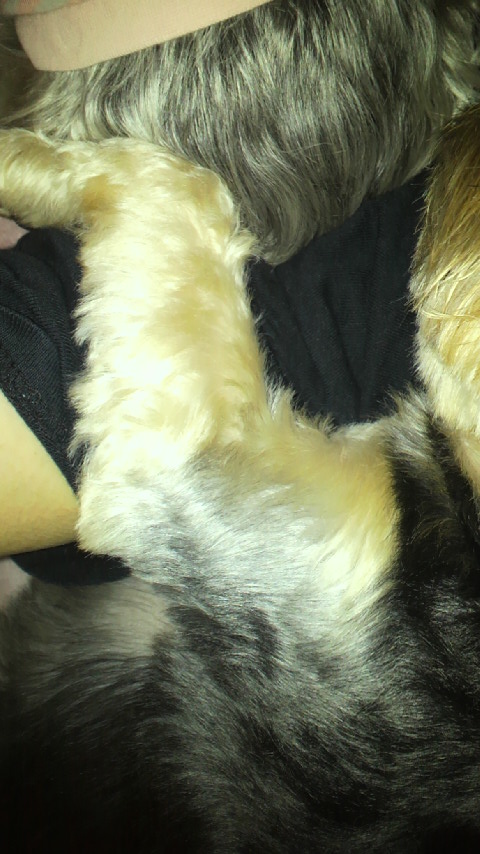 ふとんの中。 いつもそばに寝てるんだけど。。朝あまりに可愛くて急いでパチリした。。大ちゃんが可愛い2本のフワフワの手を私の手にからませてる。。(大地の手の上のグレーの毛はくぅのお尻(^_^))このせいで私なかなかお布団から出れなかったよ。