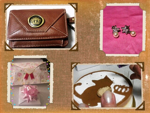 12月 あっと言う間に12月。1日は私の誕生日。こんな年になってもおめでとうの言葉は嬉しかった!ピアスは仁が選んでくれたって。外食、猫ちゃんのケーキ、小さく写ったけどそこそこ大きかった。(仁の手と私の手入れて撮りたかった・(笑))そしてプレゼント。感謝です。ありがとぉ♪