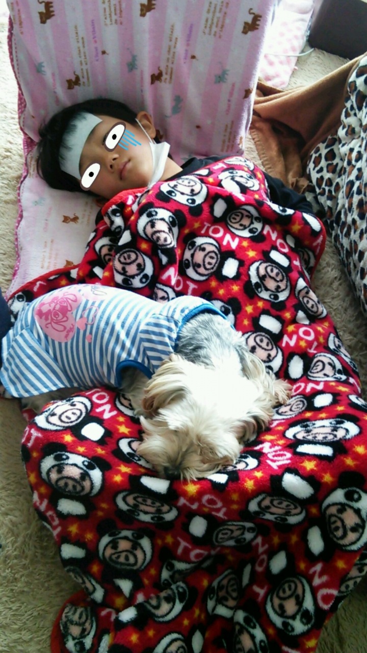 1月3日 2日から熱だした仁。長女が休日診療所へ連れて行ってくれた。なんとインフル〜!「お布団ひくまで待っててや」って言われて倒れてたらぶっちが心配してくっついてたまるで仁もぶっちの子供かのよぉに(ΦωΦ)フフフ・・可愛い〜
