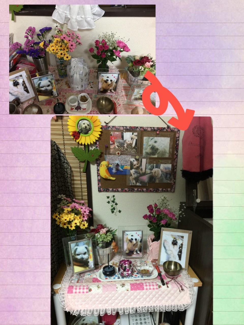 引っ越し ぶっちの居場所の引越しした。いままではケージの上で広々やったけど下で大ちゃんやらりっくんやらが暴れるたびにお骨が心配で・・・花瓶が倒れてもあかんし・・・母が使ってた棚があいたのでそれを使ってぶっちコーナー出来上がり!左には父と母の居場所のお仏壇右にはこれまた母が使ってたドレッサー。いい場所だね。ぶっち。病院通いに着せてたピンクのコートもそこへ吊ったこれも捨てられないよ